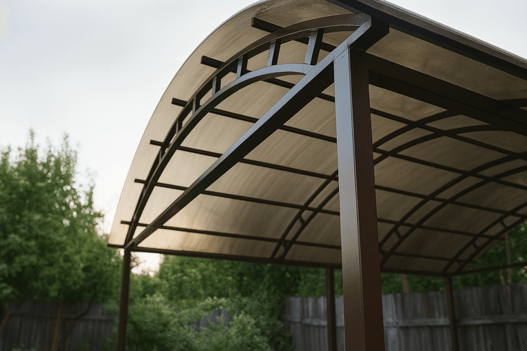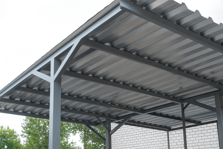 Изготовить навес из профильной трубы можно в сжатые сроки — технология позволяет точно рассчитать нагрузки и обеспечить надежность конструкции. Такие навесы подходят для маленьких участков и просторных парковочных зон.