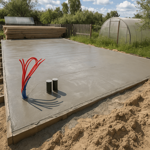 Монтаж опалубки по периметру фундамента, установка арматурного каркаса, рассчитанного под вес конструкции и условия эксплуатации. - Заливка бетона