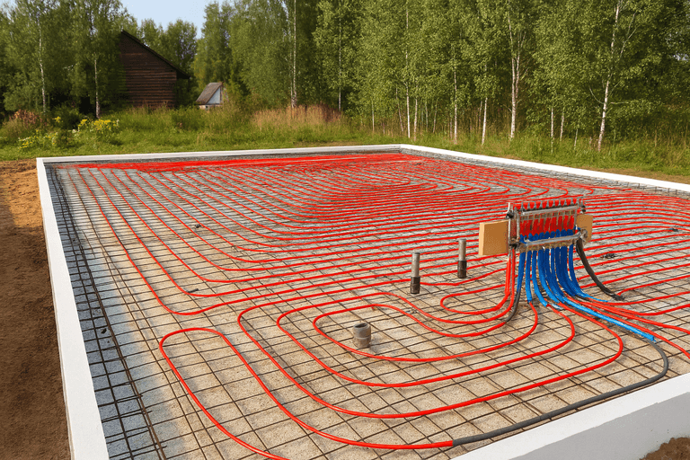Перед армированием укладываются трубы канализации, водоснабжения и другие коммуникации с выводами под дом. - Монтаж опалубки и утепление